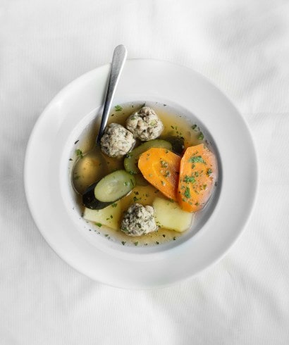 This recipe is based on the traditional Ashkenazi (Central/Eastern European) Jewish chicken soup, which is commonly made with dumplings called matzo balls. Matzo is the traditional unleavened “bread” eaten by Jews during the holiday of Passover to recognise the haste with which the Jewish slaves escaped Egypt in the old story of the Exodus. It is a little bit like a large water cracker, and is ground to a sort of rough flour called matzo meal, which the matzo ball dumplings are made from. For those who grew up on it, this is real comfort food, but matzo meal is not easy to get hold of in New Zealand and to be honest it is not particularly flavoursome. When I came to replicate the soup at the restaurant, I found the matzo balls unsuitable, so I’ve developed my own version – Kiwi matzo balls, with chicken meat and semolina. The soup itself is a very rich chicken stock with few vegetables. When the dumplings are cooked in the soup, the semolina absorbs the liquid with all its flavour, which makes the dumplings very light and tasty.