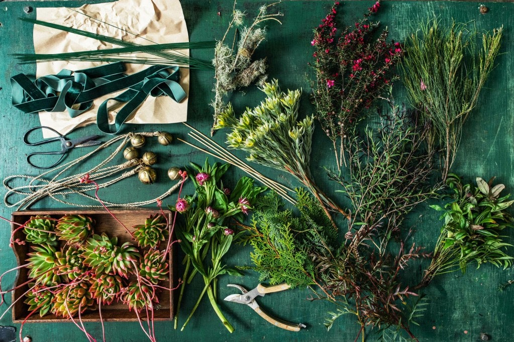 Gather together floral wire, ribbon or rope, and flowers and foliage that won’t wilt if they’re not in water. I chose crimson-flowering mānuka, strawflowers, fir, thuja, leucadendron, lichen-covered twigs and echeveria, along with some baubles in antique shades, and bells for jingling!