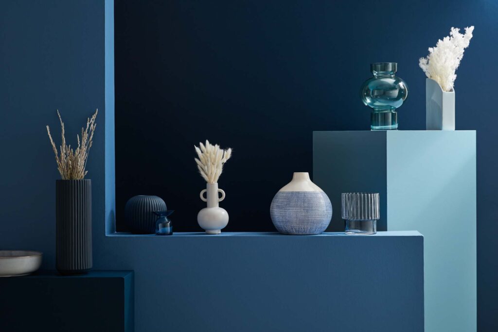 Salt & Pepper Relic serving bowl in blue, $69.99 from Farmers. Tall ribbed vase in midnight, $79.99, and round ribbed vase in midnight, $49.99, both from Nood. M & Co Flare glass vase in blue $9.99 from Farmers. Louis vase in white, $35 from Thread Design. Clunes vessel in denim, $54.95 from Freedom. M & Co Ridgeline votive in smoke, $17.99, and M & Co Anders vase, $19.99, both from Farmers. M & Co Curve vase, $19.99 from Farmers, painted in Resene Powder Blue. All Resene paints available from Resene ColorShops.