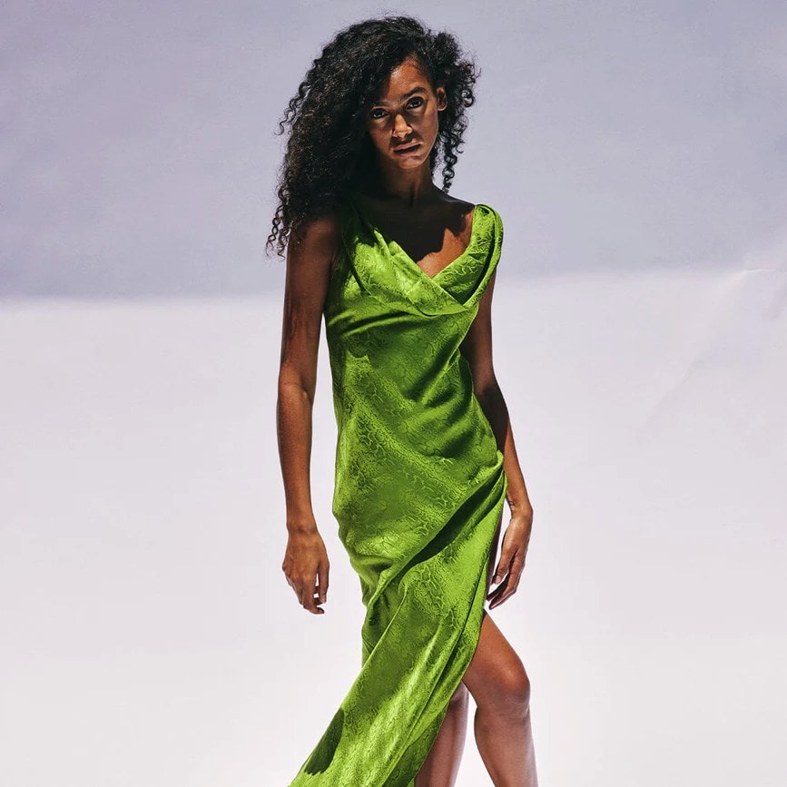 To me this dress screams luxury. Made from silk in a shade of lime green, Navarra has a beautiful cowl neck, a low back framed with cross detailing and a side slit. The fabric is printed with a muted snake print, which adds texture but is softened the perfect amount.