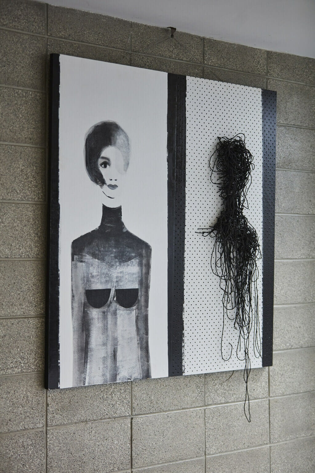 Her work focuses on strong female characters, with a powerful presence. Her large paintings centre on two figures that are one and the same, a realistic figure and its more abstract side. Meanwhile, her “wirehead” drawings have evolved from a history of sketching. Inspired by a lifelong fascination with faces, expressions, body and gesture, Sarah has created these women through “uncontrolled and controlled chaos”. Her paper works include ink and the stitching of a thick thread, which keeps its natural curl for a more 3D effect. She also works with Perspex for a unique texture.