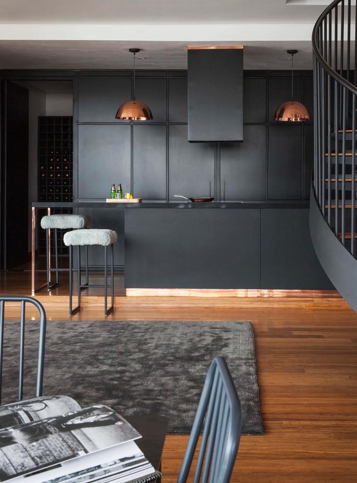 When it comes to kitchens in urban locations, especially in old industrial buildings, you can really go for broke with black, as it suits the architecture well. Layer it on, then add warmth with gleams of copper or brass.
