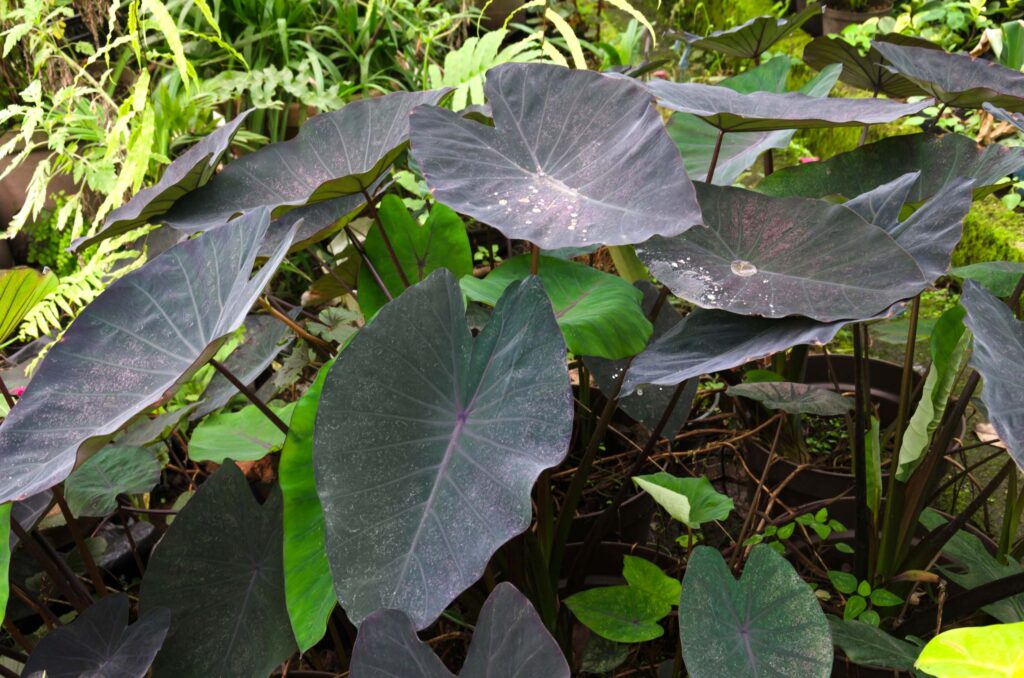 Foliage lovers, here is one for you. Taro, or colocasia, with its magnificent heart-shaped leaves, already has edgy sculptural chops but is even more striking when adorned in a dusty black cloak. ‘Black Magic’ is a spectacular muted dark grey, reminiscent of bat wings or elephant ears. These tropical beauties are frost-tender, like boggy, damp areas in a garden and can be grown along the edge of a pond.