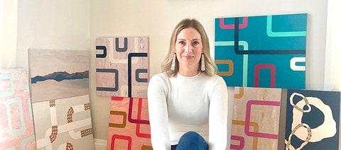The light timber cladding inside dominates the cabin, and Kim says they chose to embrace this feature and use the palette of the wood to make it part of the aesthetic. Anything added needed to blend or complement it, which led her to selecting blonde and neutral fabrics and woven elements, for example. Small concessions to glamour were made by choosing a white kitchen counter embedded with recycled glass fragments, and a bronze and marble coffee table.