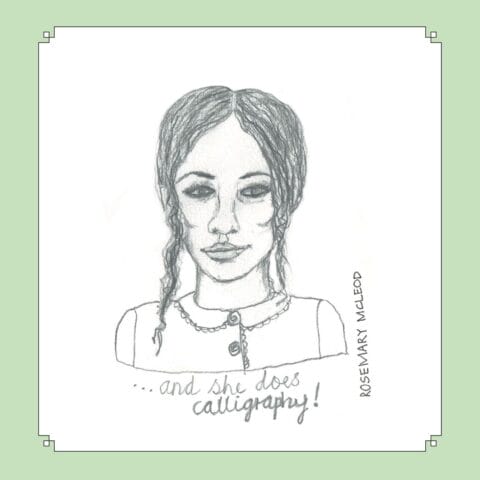 Illustration by Rosemary McLeod of a young girl saying Mum says sort the prenup first and young boy with an arrow pointing at him and words saying Small but unlikely genius