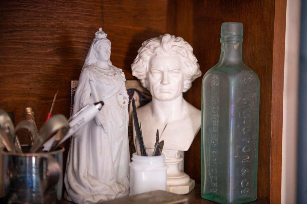 Naturally, I have the usual old-lady collection of pretty but annoying china which I can’t put in the dishwasher, so it spends most of its life on display in my dresser. Alongside that are a couple of plaster figures: there’s Queen Victoria (which dates from the 1990s, when my husband Keith and I owned a second-hand shop) and Mozart, plus a random gathering of animal-inspired jugs which took my fancy.