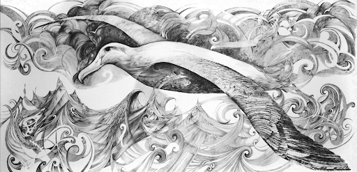 In the shadowed, bush clad hills on the city end of the harbour, one of Dunedin’s artists, Danielle Mathieson, has a live stream of Otago’s Royal albatross communal roosting spot, as a constant visual backdrop to her everyday life. A wild ground of beauty to which her gaze is naturally often pulled when the wind blows in from the south west, bringing with it flights of Northern Royal albatrosses. Her love of New Zealand’s Northern Royal albatross, alongside her lifelong passion for giving voice to our endangered birdlife through her artwork led Danielle to draw, in black and white, a hauntingly beautiful drawing of the Northern Royal albatross soaring low over the Southern Ocean. The art piece is long enough to include their true to scale wingspan of three metres, each feather exquisitely detailed. Hidden deftly within the drawing are images of the human actions that threaten their life on a daily basis. Looking closely, you might notice pieces of discarded plastic, long line fishing hooks, fishing cables and netting.