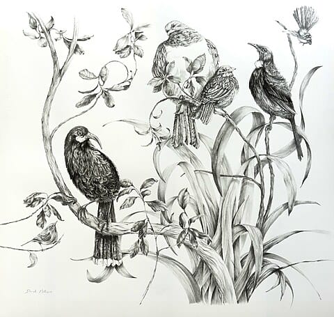 These are similar layers of feeling that arose for Danielle when she began drawing the birds that inhabited her Palm Beach home valley on Waiheke Island where she, her partner David and two children, Juliet and Leo, lived for many years.