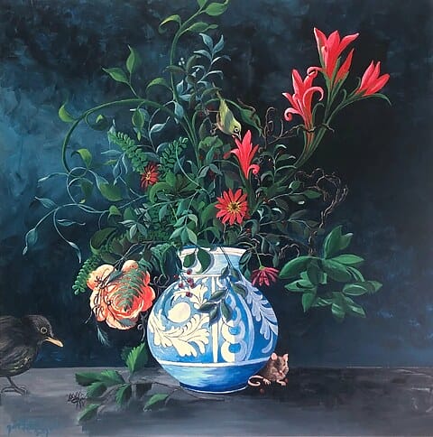 A challenge Danielle was happy to move closer toward was putting down her drawing pencil for a while to paint on a large canvas the small things reflecting the lingering beauty of the garden around her. Using test pots of house paint, she brushed onto her canvas the fragrant sweet Juliet rose and plants that had woven themselves through the veranda railings, alongside the visiting birds and other creatures that Juliet and Leo had befriended.