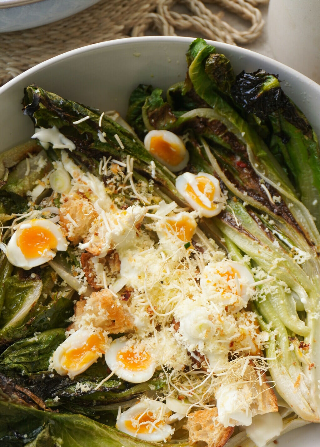 Add the lettuce to the bottom of your desired dish. Spread on the dressing, then sprinkle in parmesan powder. Add sliced eggs, bread crumbs, and a final wink of seasoning. This is best eaten right away, but will last in the fridge to snack on.