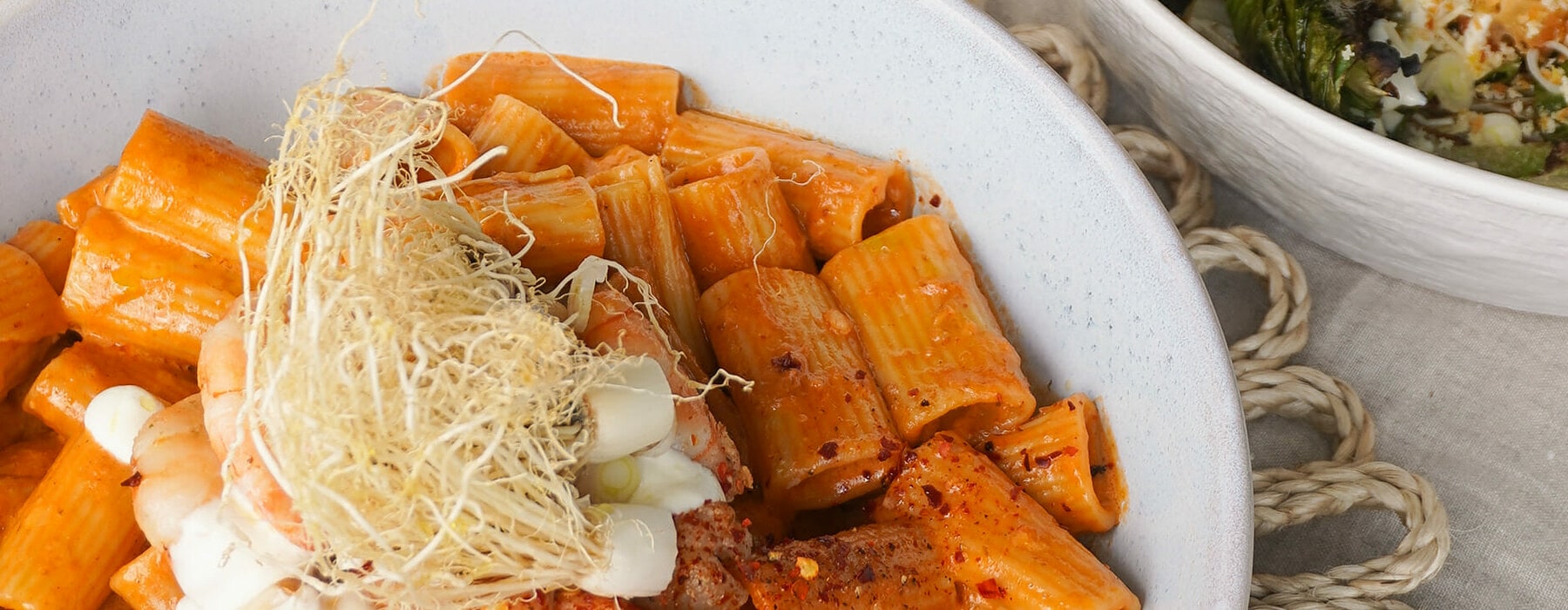 Just as the pasta is cooked, I transfer the sauce out of the saucepan and use this pan (without washing) to cook the meat of the prawns. Stir around the remnants of the sauce with the cooking prawns to glaze. Once the translucent touch is just removed, the prawns are ready. Plate and eat fast, before your neighbors steal the leftovers! I love to top mine with fresh olive oil, chilli flakes, and pickled spring onion roots!