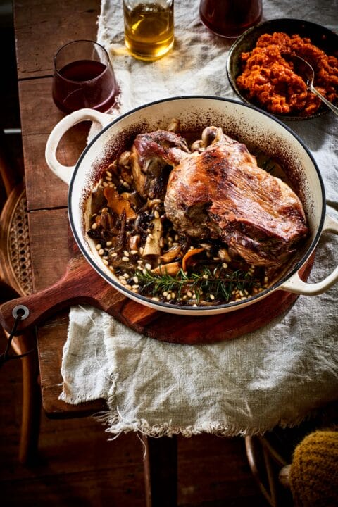When they become lightly coloured, add ¼ cup of white wine to deglaze your pan. Reduce this down, then add the fish stock and bring to a boil. Add your remaining wine and herbs. Simmer for a further 20 minutes. Add the salt and lemon zest to taste